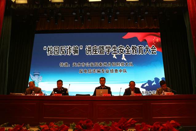 11月15日晚,beat365官方网站在校文化礼堂举行“校园反诈骗”专题讲座暨学生安全教育大会。天水市公安局秦州分局刑侦大队反电信诈骗专业侦查中队陈方方、王朝东两位警官做了专题讲座,学院相关领导就政治安全、人身安全、财产安全、食品安全、实验室安全等方面做了全面讲解,并就beat365官网安全稳定工作做了安排部署。学院党总支副书记刘正、副院长李志锋、各班班主任、全体辅导员及在校学生共计650余人参加会议。