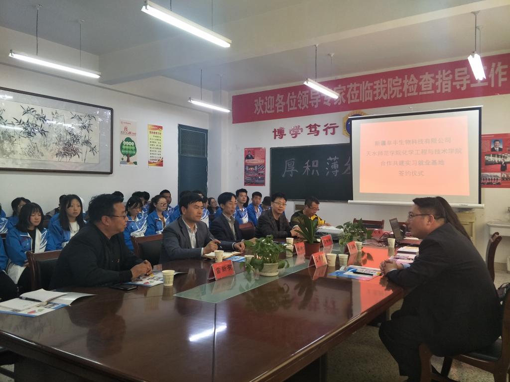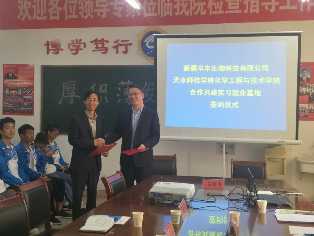 新疆阜丰生物科技有限公司人力资源部副总经理王中凯、天水师范学院招生就业处处长雒曲波、beat365官方网站院长刘新文、副院长吕玲玲、阜丰人力资源部部长邓海燕、beat365官方网站应用化学系主任司长代博士、就业专职辅导员杨基铎及学生代表出席、见证签约仪式。