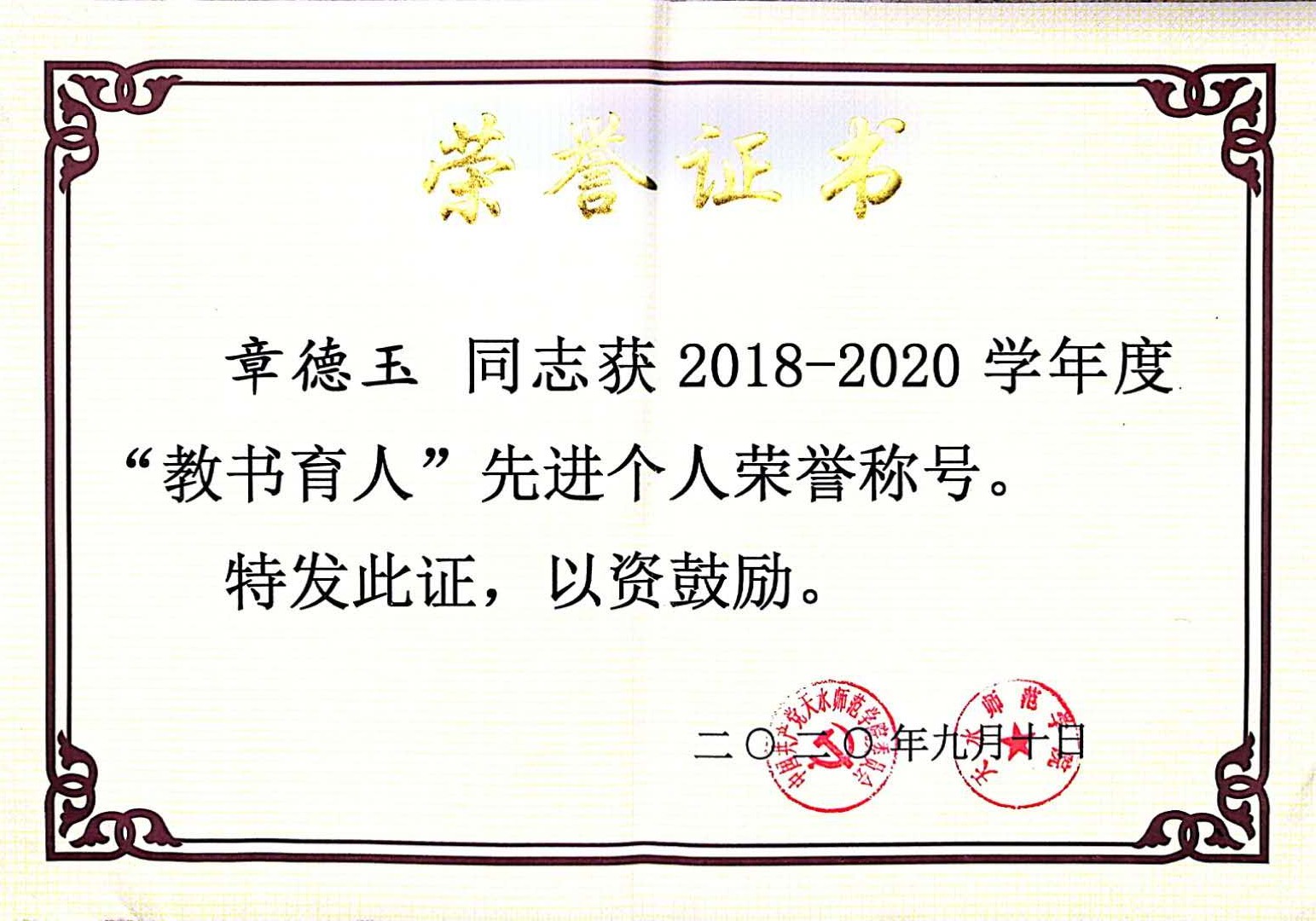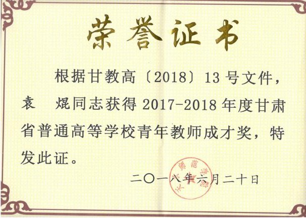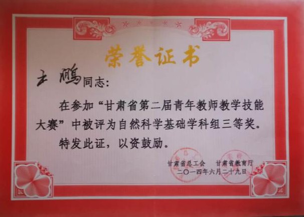 近年来,学院在新进青年教师中实施“青年教师培养导师制”,使青年教师尽快熟悉教学过程,成长为教学能手。鼓励年轻教师攻读博士学位,十三五期间,共引进博士13人,4位教师获评正高级职称,2位教师获评副高职称,3位教师攻读博士学位。1人入选教育部“新世纪人才”,2人被聘为甘肃省“青年飞天学者”,1人入选甘肃省领军人才,1人荣获甘肃省园丁奖,5人荣获甘肃省高等学校青年教师成才奖,9人入选beat365官网“青蓝人才工程”。1位教师获天水师院“四有”好老师,11位教师荣获天水师院“三育人”先进个人,2位教师获天水师范学院第三届教学优秀奖。在校级“微课竞赛”中,1位教师荣获一等奖,1位老师荣获二等奖。