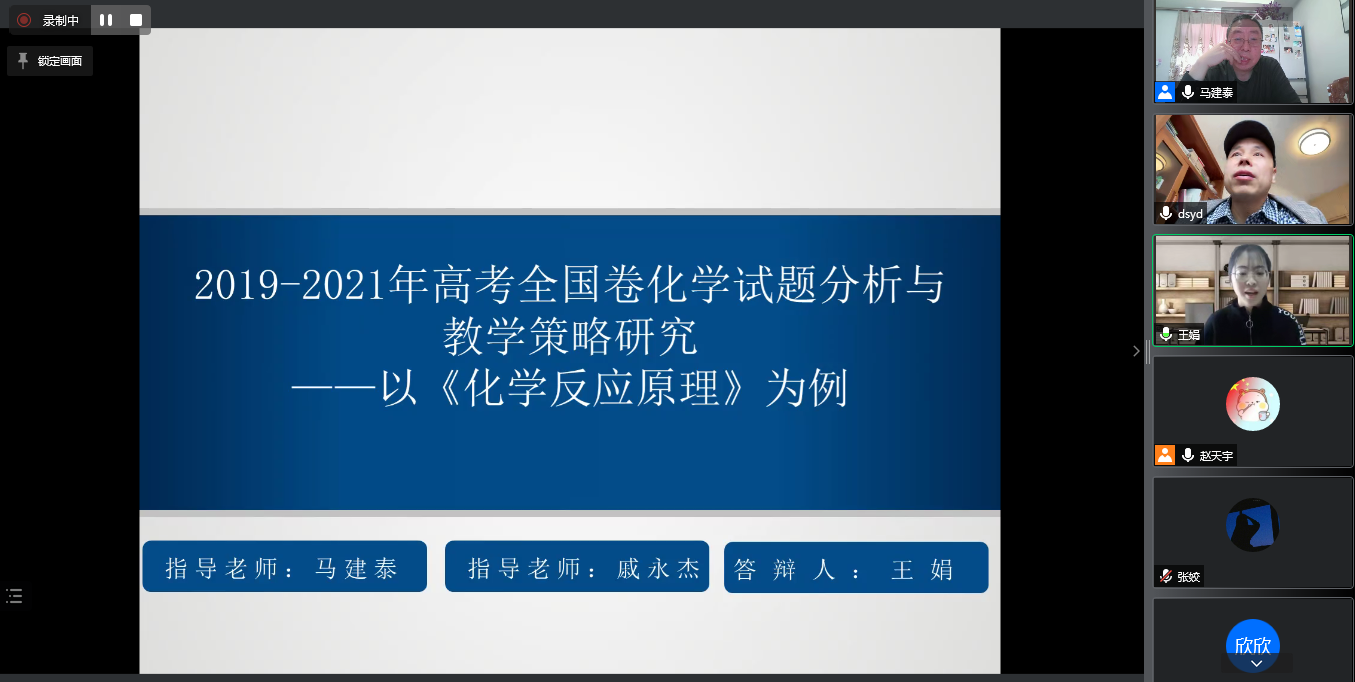 根据研究生处工作安排及近期疫情防控工作的要求,为保障2022届教育硕士研究生学位论文的高质量完成,beat365官方网站通过认真制定线上教育硕士学位论文预答辩工作方案,周密安排整个答辩流程,于3月28日在腾讯会议平台举行了2022届学科教学(化学)教育硕士研究生学位论文预答辩。此次线上预答辩共有13位教育硕士研究生参加,2021级全体研究生在线旁听观摩。