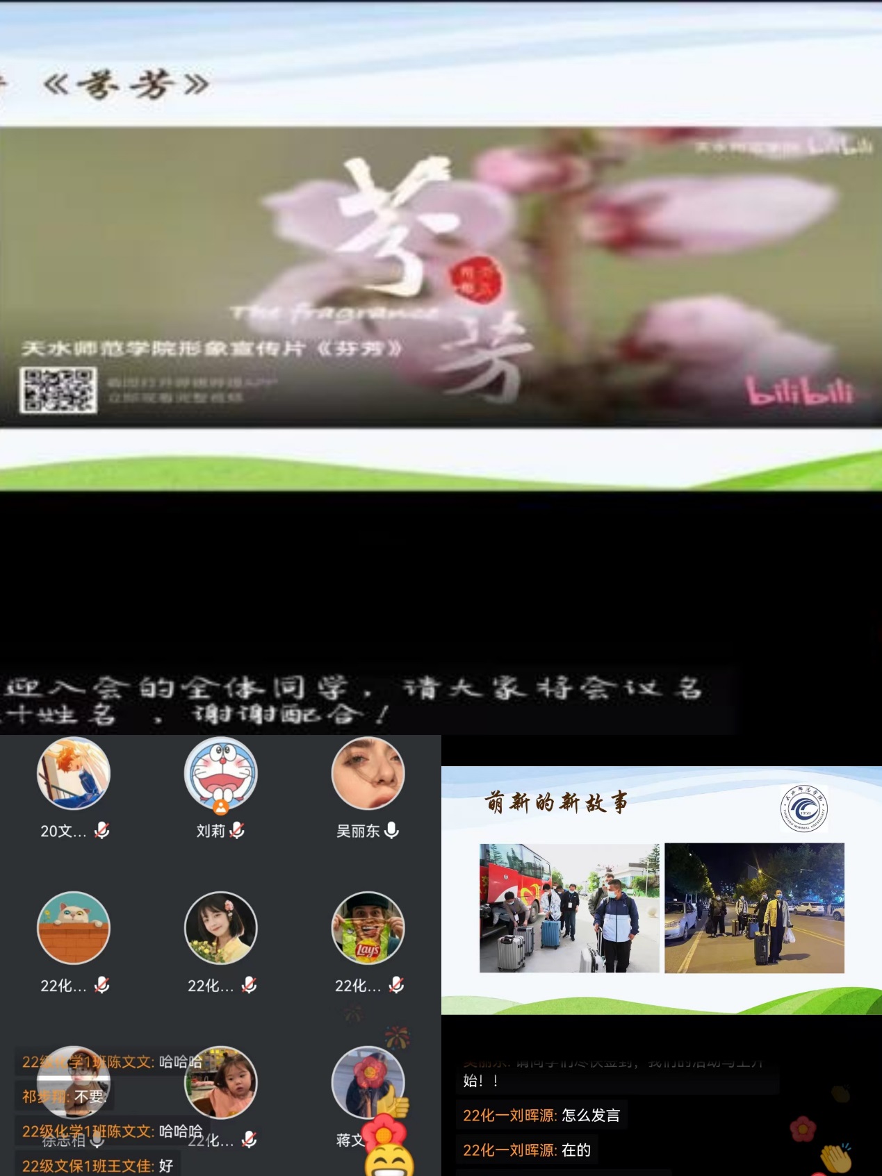 座谈会上,首先为2022级新生播放了beat365官网宣传片《芬芳》,视频中向大家展示了羲皇故里,丝路明珠,龙城天水。随后,20级和22级学生干部带领新生共同合唱了天水师范学院校歌《我的精神家园》。最后,20级与21级学生代表分别发言,给大家分享了她们精彩的团故事,畅谈了在学校学习生活的感受,并为新生解决了他们生活与学习中遇到的问题。