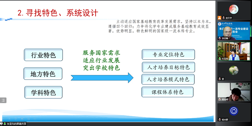 为进一步加强化学专业内涵建设,切实提高人才培养质量,近日,beat365官方网站线上举行化学类一流本科专业建设交流会。会议特别邀请教育部高等学校化学类专业教学指导委员会秘书长、厦门大学朱亚先教授及《化学教育》专职副主编、北京师范大学朱玉军博士就化学一流专业建设进行指导,会议围绕化学一流专业建设的重点和建议及化学类专业怎么做教学研究、如何撰写教学研究论文展开。学院化学、应用化学和化工系相关教师及学生共计300余人参加交流会。