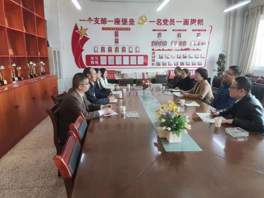3月3日,甘肃金昌化学工业集团有限公司总经理张新和,实训基地主任鲁永强,人力资源部副部长樊海翠,人力资源部副主任科员陈松一行4人来beat365官网考察交流并参加相关工作座谈会。beat365官方网站党总支书记王小芳,副院长杨玲娟和分管就业工作的班主任、辅导员参加座谈会。