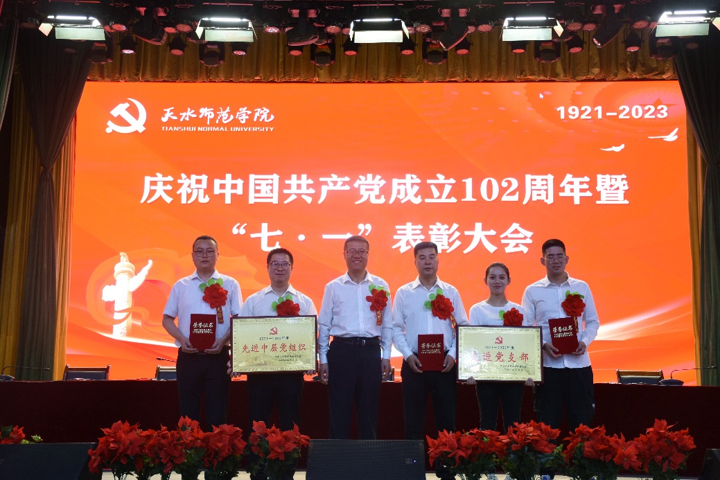 为推动学习贯彻习近平新时代中国特色社会主义思想主题教育和“三抓三促”行动走深走实,充分发挥先进典型、模范师生的示范引领作用和基层党组织战斗堡垒作用,激励全校各级党组织和广大党员立足岗位做贡献、踔厉奋发建新功。6月29日上午,天水师范学院庆祝中国共产党成立102周年暨“七﹒一”表彰大会在大礼堂举行。大会对 2021—2023 年度在学校改革发展稳定中涌现出来的先进基层党组织、优秀共产党员和优秀党务工作者进行表彰,进一步激励引导全校上下重温党的光辉历史,弘扬伟大建党精神,发挥先进典型的示范带动作用,激励基层党组织和党员坚定信念、履职尽责、奋发有为。