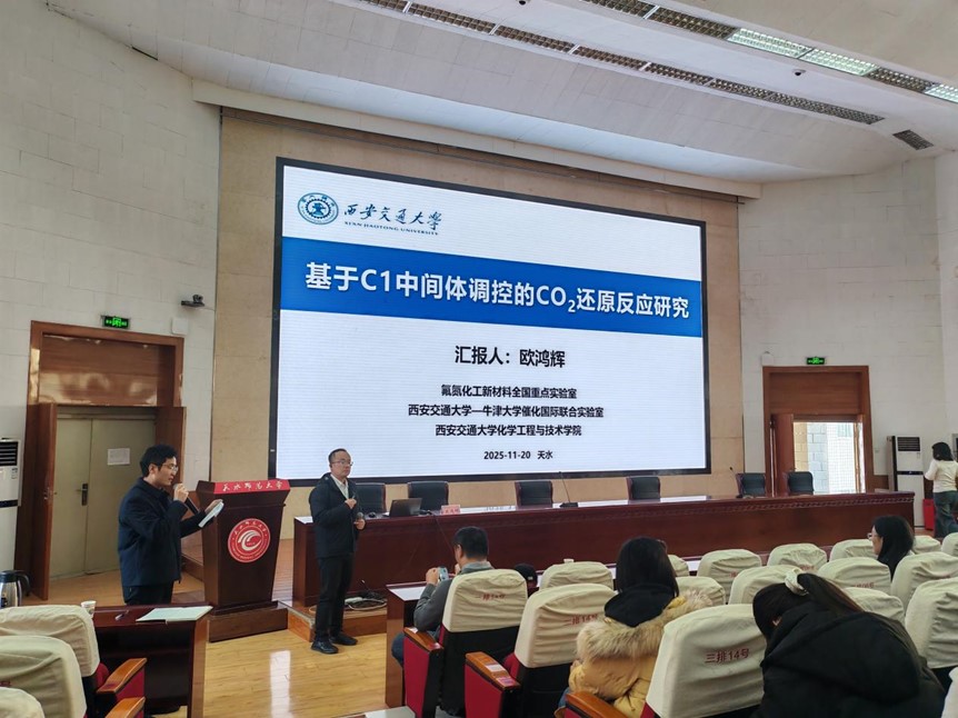 学术报告会上,张贵刚研究员系统介绍了结晶氮化碳光催化全分解水制氢的优势和挑战,针对氮化碳热聚合过程中存在的关键科学瓶颈,分享了其科研团队近年来的创新性研究成果,通过提高氮化碳聚合物结晶度,加快光生电荷分离和转移;发展了聚合物单晶合成和动力学调控新策略,提升了全解水量子效率;发展了光生电荷高效利用新途径,能够有效提高太阳光利用率。欧鸿辉研究员致力于光催化CO2还原反应研究,针对反应过程中动态活性位点难识别、C1中间体副产物多难抑制以及C1中间体界面反应路径复杂难调控等难题,开发了多模态结构表征技术,实现了动态演变的活性位点,以及表面H2O氧化和CO2还原的活性位点的精准识别;提出*COOH中间体的C侧吸附构型优化调控策略,实现了C1中间体物种的选择性生成;提出了中继中心介导C1中间体定向传递的策略,实现了C2+产物选择性和产率的显著提升。