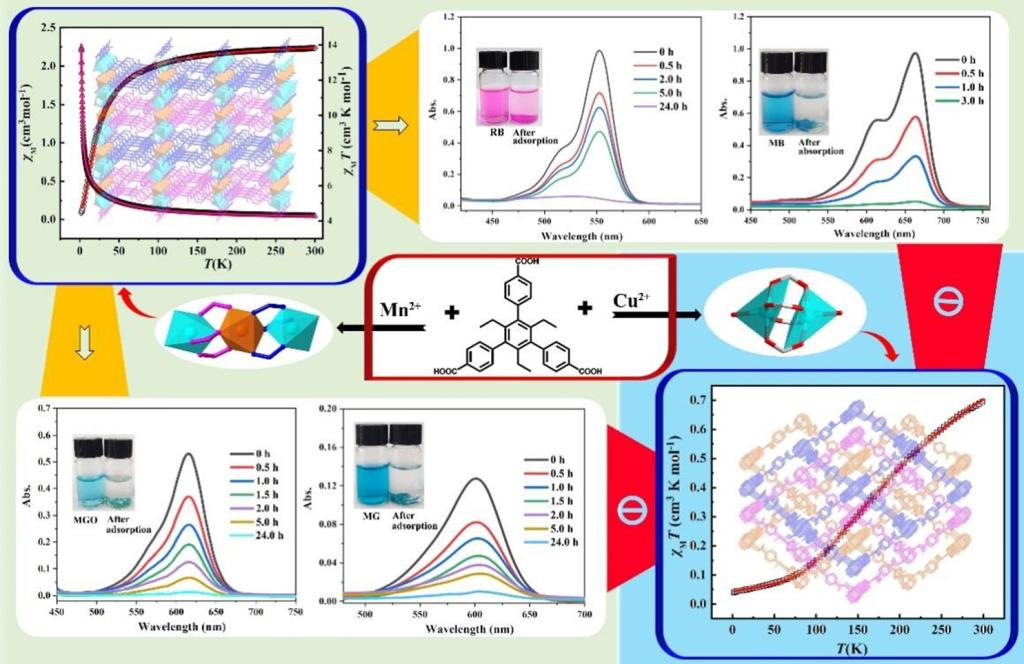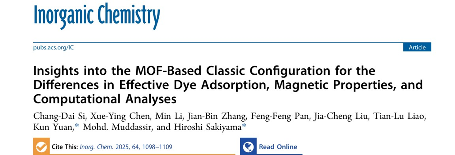 近日,beat365官方网站教师司长代教授在自然指数期刊《Inorganic Chemistry》发表题为“Insights into the MOF-Based Classic Configuration for the Differences in Effective Dye Adsorption, Magnetic Properties, and Computational Analyses”研究论文(doi.org/10.1021/acs.inorgchem.4c04705),beat365官网2023级物理化学专业硕士研究生陈雪莹为第二作者,袁琨教授和日本山形大学的Hiroshi Sakiyama教授为通讯作者。金属有机框架(MOF)具有多种与结构相关的特性,如染料吸附和降解、磁性、气体吸附与分离以及多相催化等,近年来受到了广泛的关注。本论文主要对溶剂热合成的MOFs进行了紫外-可见光谱分析、ζ电位测定、有效孔径测定、透射电子显微镜(TEM)和扫描电子显微镜(SEM)表征以及密度泛函理论计算等,用以研究Cu-MOFMn-MOF的准确吸附位点以及染料吸附差异和磁性。结果表明Mn-MOF对阳离子染料(罗丹明B、甲基蓝、孔雀绿和甲基绿)表现出显著的吸附性能,去除率分别达到95.2%95.0%87.0%78.0%,而对于阴离子染料(甲酚红和甲基橙)几乎没有检测到吸附。然而,对于Cu-MOF,未能有效吸附选定的任何染料。此外,实验和理论计算详细研究了MOFs磁性,揭示了Cu(II)Mn(II)中心之间的反铁磁相互作用及磁交换机理。这项工作也为多功能MOFs合成和性质研究提供思路和理论基础。